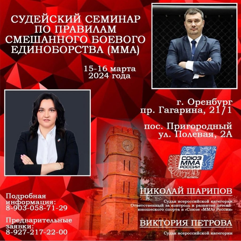 15-16 марта 2024 г. в г. Оренбург, пр. Гагарина, 21/1 и пос. Пригородный ул. Полевая, 2А пройдет Судейский семинар по правилам смешанного боевого единоборства (ММА).