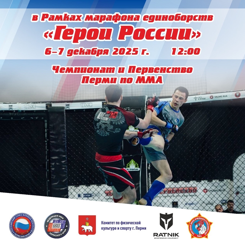 6 декабря 2025г. пройдет Чемпионат Перми по Смешанному боевому единоборству (ММА) и Первенство Перми среди старших юношей 16-17 лет .