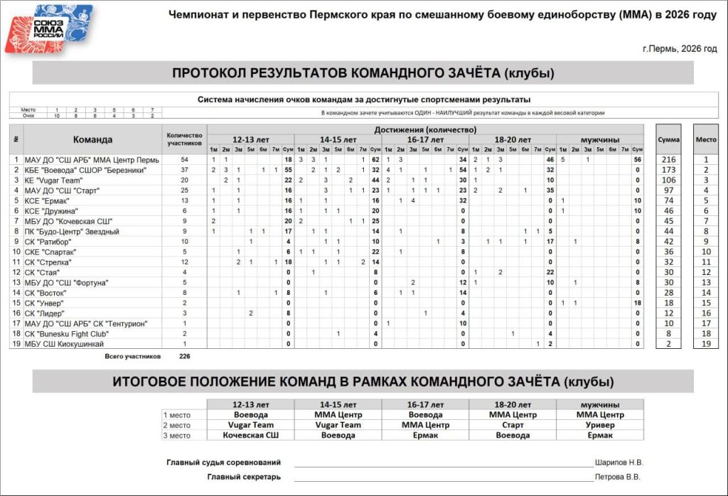 Рейтинг клубов после чемпионата и первенства Пермского края по ММА 2026